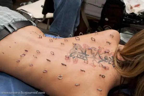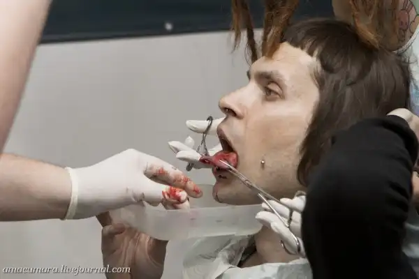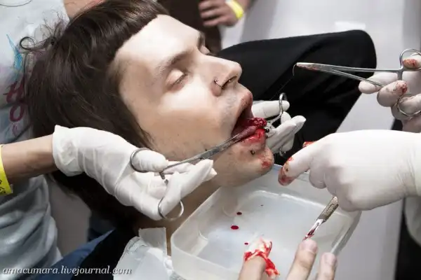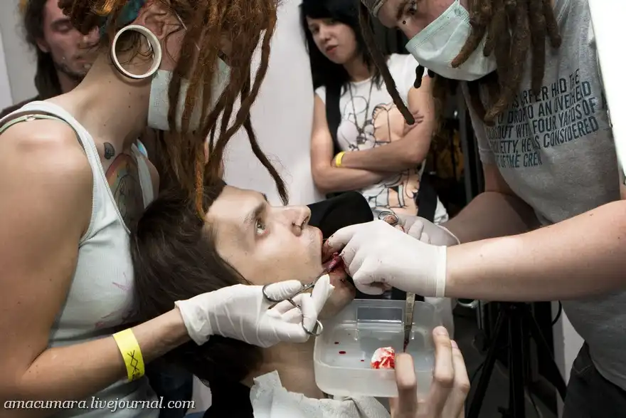 Далее большой фоторепортаж о бодимодификации. Для смелых сразу же предупрежу, что там "змеиный язык", подвешивание на крюках и "корсет". В заглавие вынесена самая безобидная фотография с эмоциями.