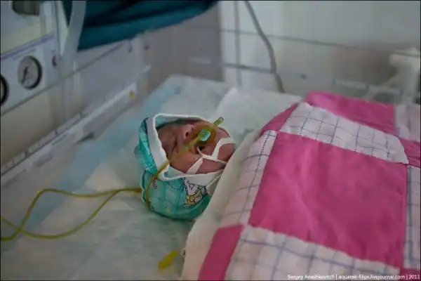 Жизнь другой девочки зависит только от сложного оборудования, способного искусственно поддерживать жизнедеятельность организма. Обычно здесь находятся недоношенные детки. Но эта девочка родилась почти в срок. Вот только весит она 1 кг 70 грамм.