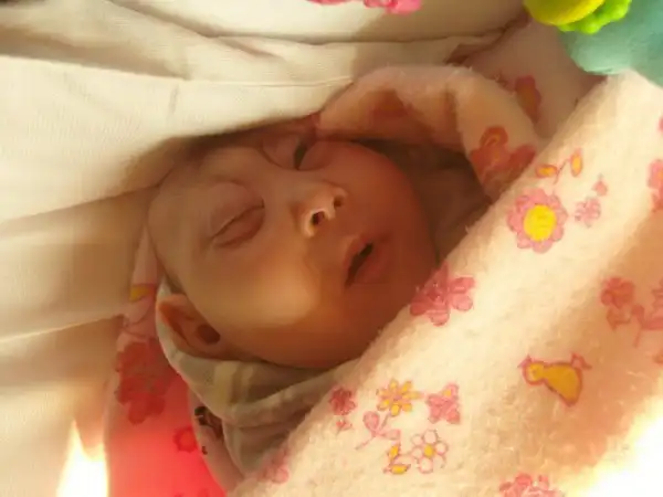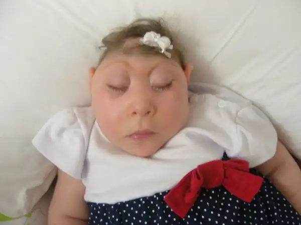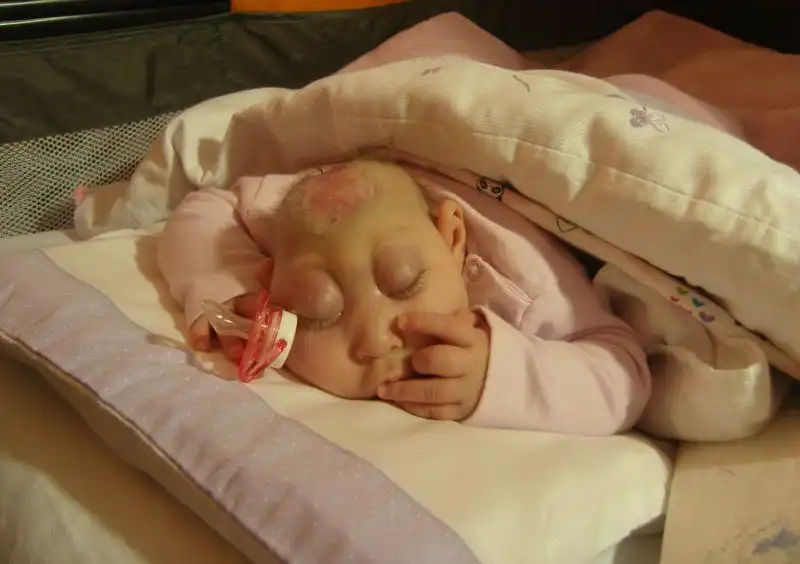 Очень страшная болезнь у этой девочки. У нее нет половины черепа. Родители вместе с врачами борются за ее жизнь. Не для слабонервных.