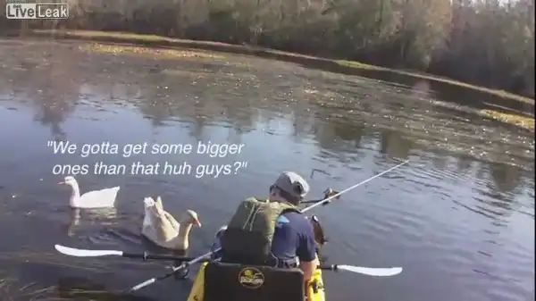 Во время рыбалки "дружелюбный" гусь атаковал рыбака.
