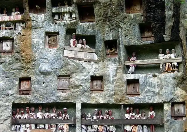 Торайя – племя, живущее на юге Сулавеси, Индонезия, получившие известность из-за весьма оригинального способа хоронить умерших. Несмотря на то, что большинство членов племени Торайя являются христианами, у них еще сильны старые верования. Похороны в племени отмечаются очень пышно, включая пожертвования десятков буйволов и свиней.