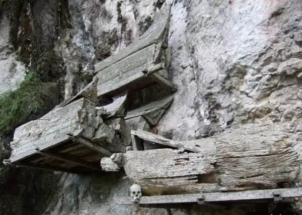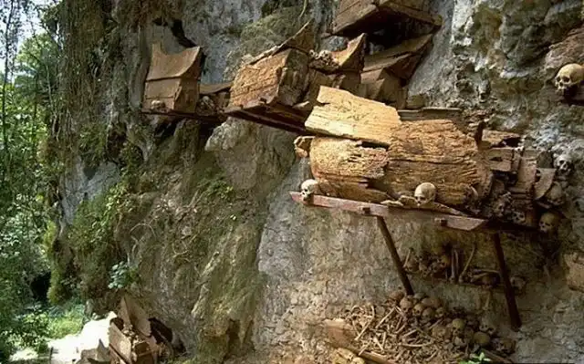 Гробы с умершими, которым не хватило места в скале, висят на ней. Они украшены геометрическими формами, но со временем, когда дерево начинает гнить, обнажаются белые кости. Некоторые члены племени Торайя проявляют изобретательность в надежде сэкономить и хоронят нескольких членов семьи в одном гробу. В конце концов, крепления не выдерживают и ломаются под весом тел. Но, судя по количеству костей в нижней части скалы, это никого не беспокоит.