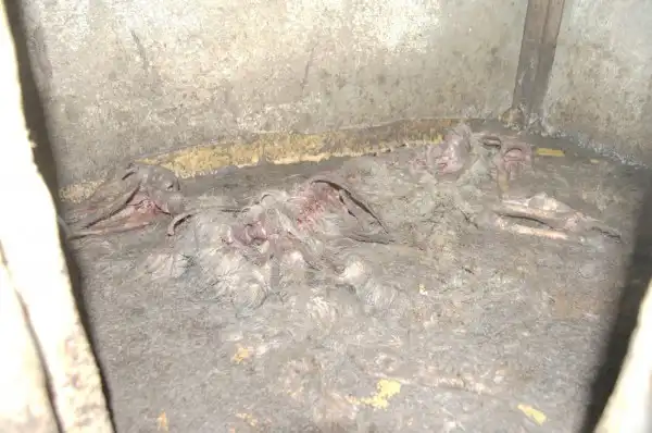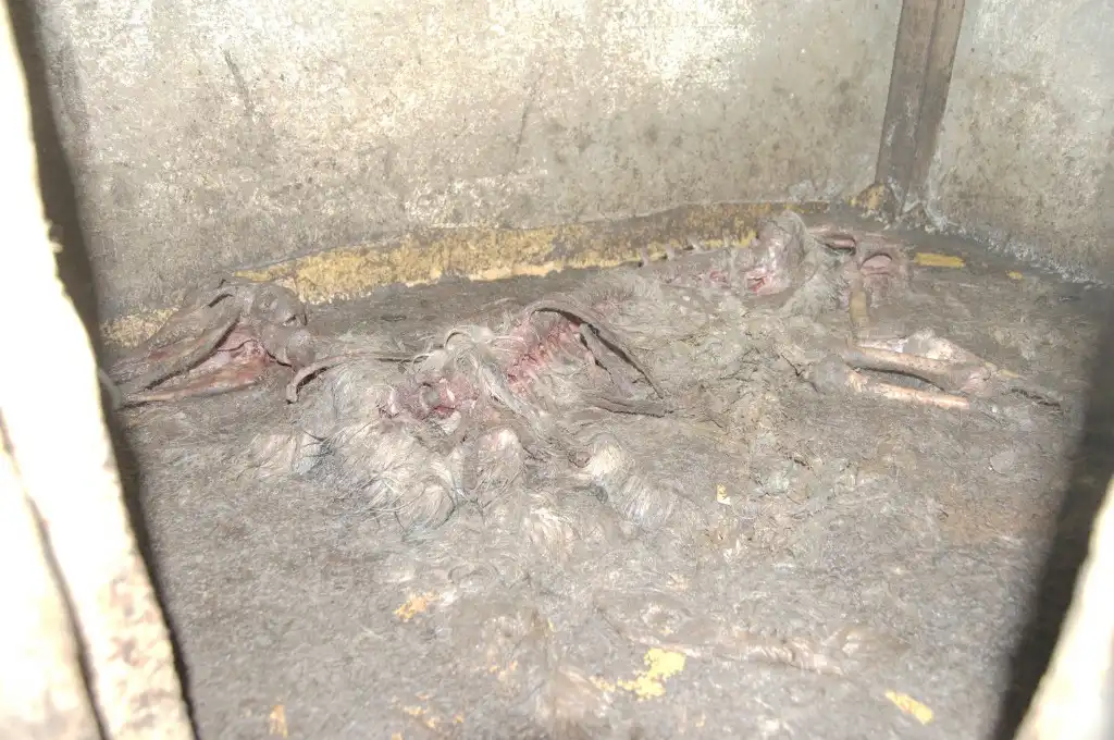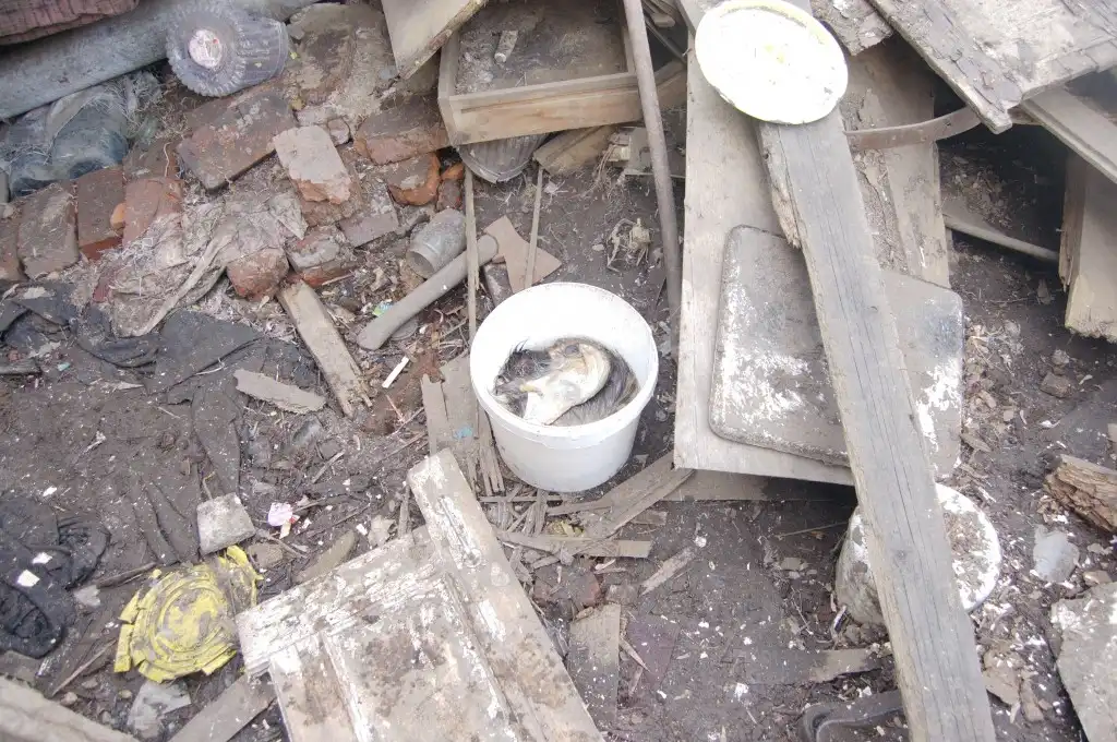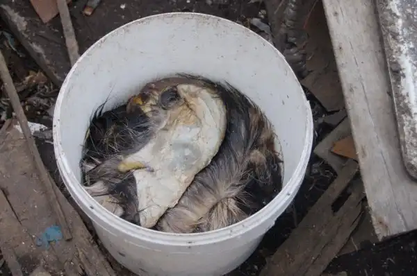 с одной из мёртвых собак , этот урод содрал шкуру , положил её в кастрюлю посреди двора