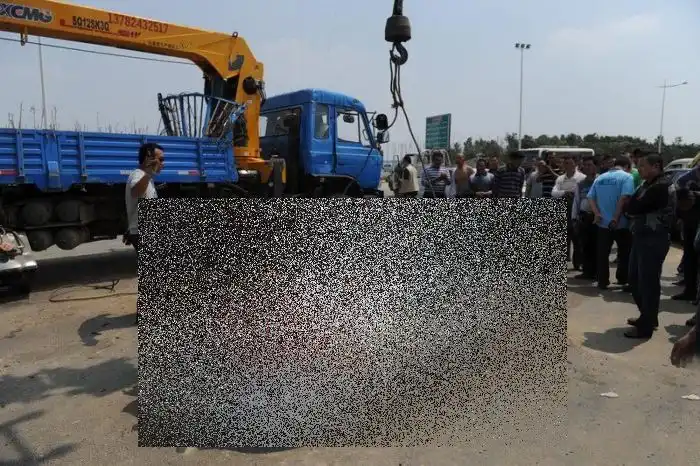 В Китае на трассе опрокинулся грузовик с погрузочным краном.