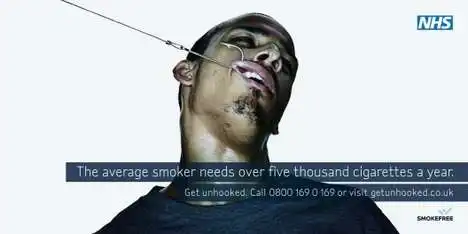 Организация NHS smokefree решила прибегнуть к методам шоковой рекламы. Кампания под слоганом "Сорвись с крючка" сопровождалась принтами с очень уж наглядным изображением этой концепции. Надпись: "Среднему курильщику требуется пять тысяч сигарет в год"