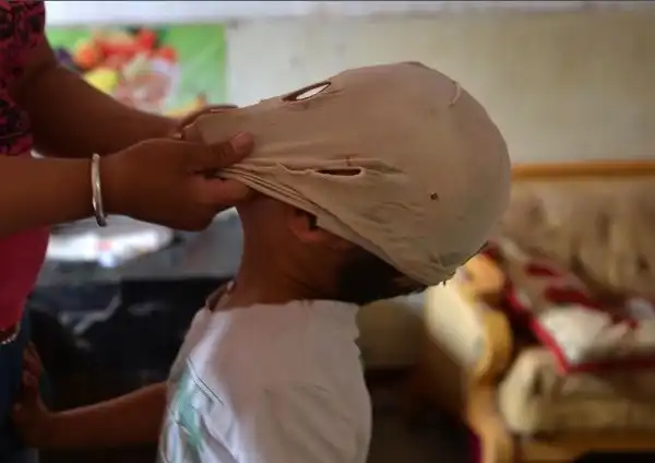 Мальчик, который во всех других отношениях здоровый малыш, должен постоянно носить хирургическую маску.