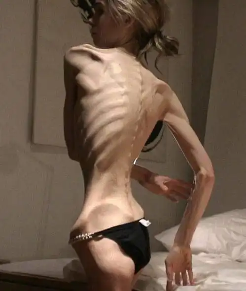 11. Саманта, 30 лет, не замужем. Саманта является просто идеалом среди анорексичных девушек! Просто посмотрите на ее стан, на ее линию бедер. В них не вооруженных взглядом видны сила воли и мужество. А как же завораживает пресс и кубики на ребрах. Взглядом с поволокой она призывно просит – ну сломай же меня, сломай меня полностью! Черные кожаные браслеты с ремнями на руках и ногах дают ненавязчиво понять, что сегодня она готова подчиняться. Подходит мужчинам, остро нуждающимся в повышении собственной самооценки.