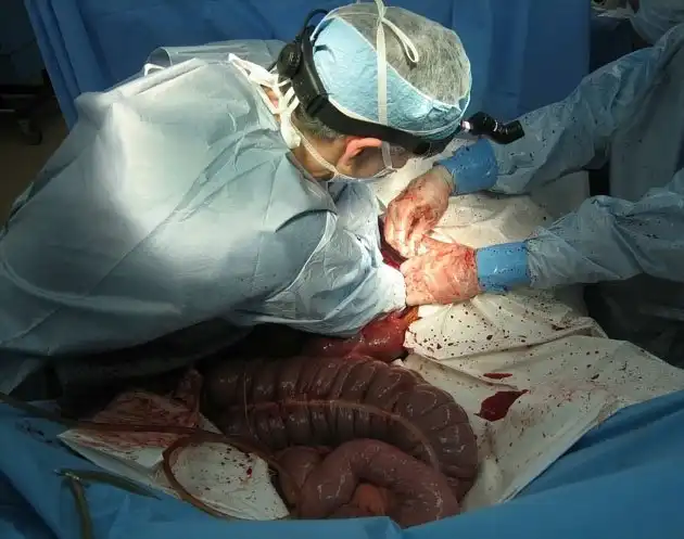 Она надута воздухом, скорее всего, т.к. перед такими полостными операциями эта кишка пустая с помощью клизмы.