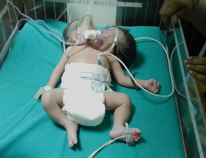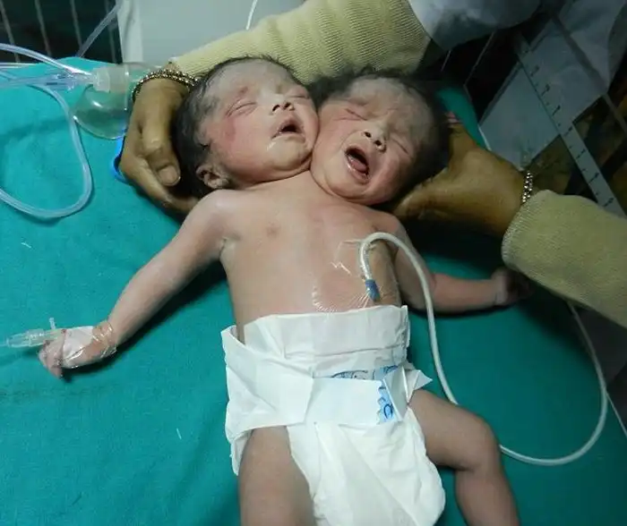 Врачи родильной палаты в индийской клинике города Сонипат были шокированы, когда на свет родилась эта девочка. К сожалению, в довольно бедном городе не у каждой будущей мамы есть возможность сделать снимок малыша до его родов еще на раннем этапе беременности. Я даже представить себе не могу, какой была реакция мамы, когда ей сообщили, что у нее родился ребенок с двумя головами...