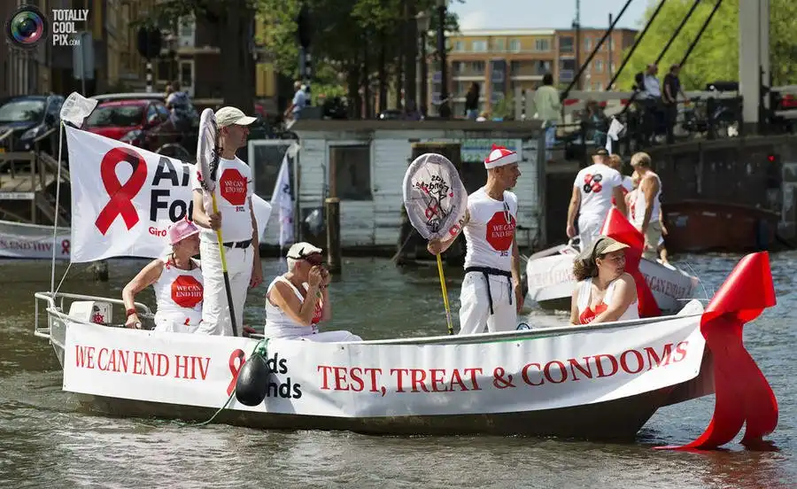 Участники, агитирующие за использование презервативов, на барже во время ежегодного гей-парада.