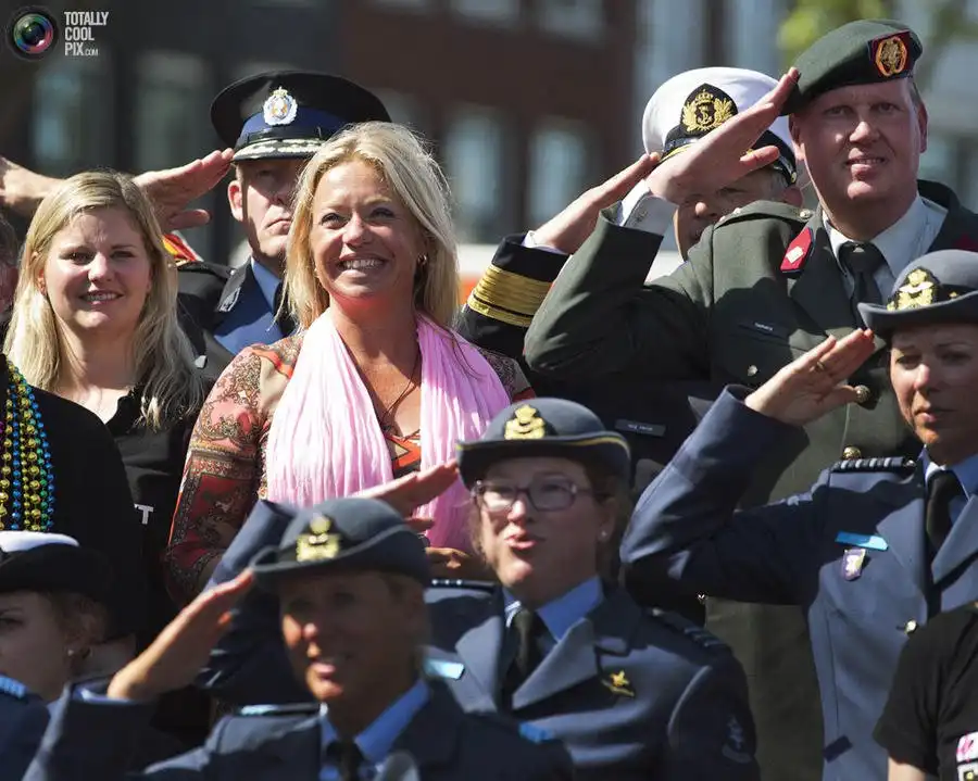 Голландский министр обороны Hennis-Plasschaert стоит на барже с голландскими военными во время ежегодного гей-парада.