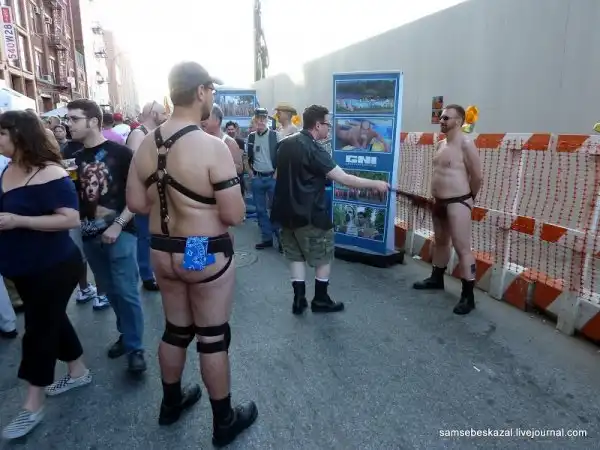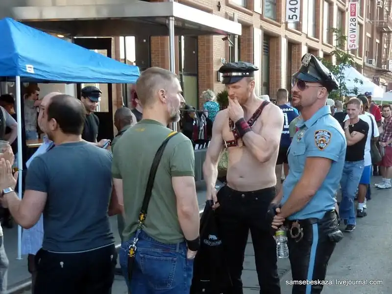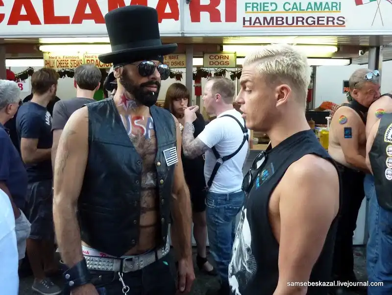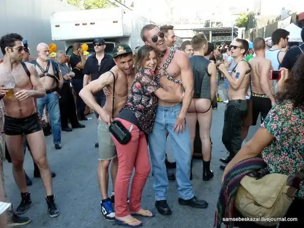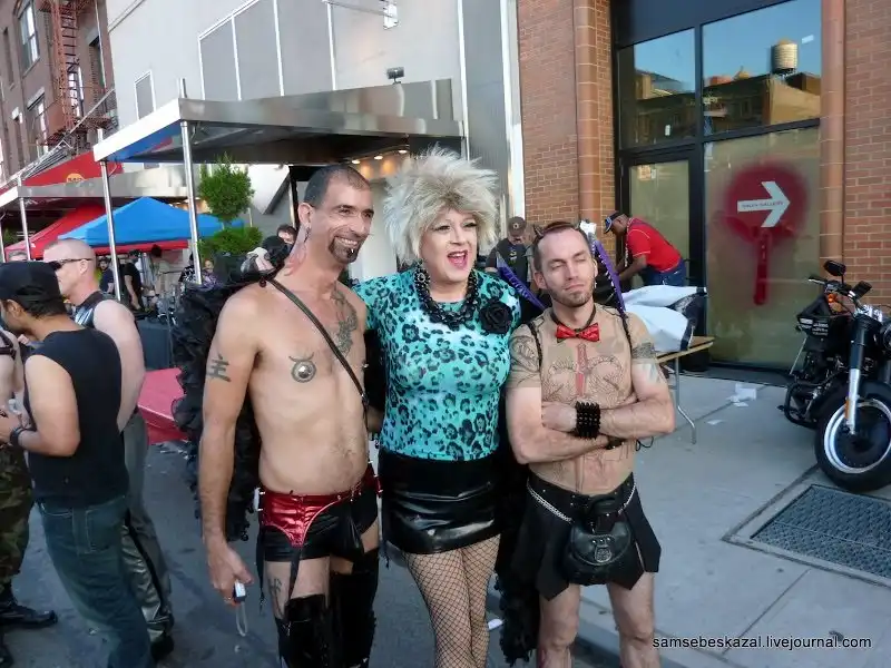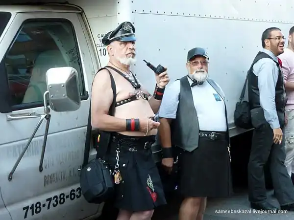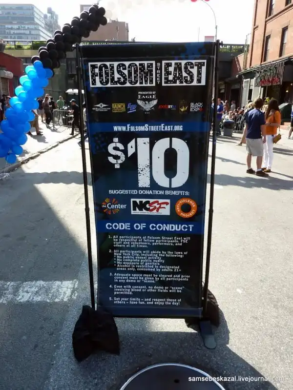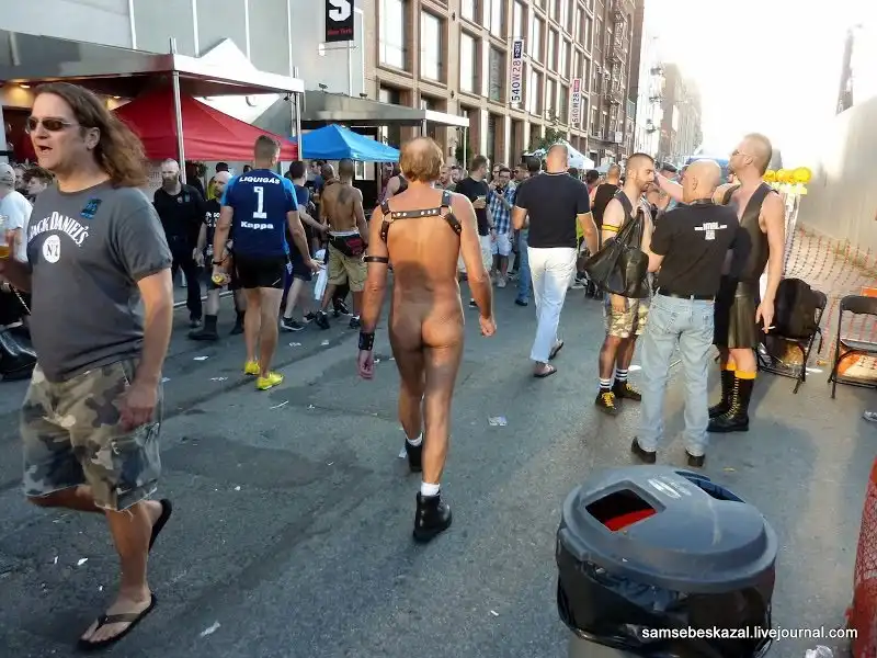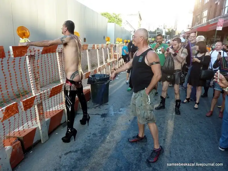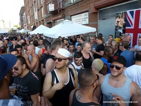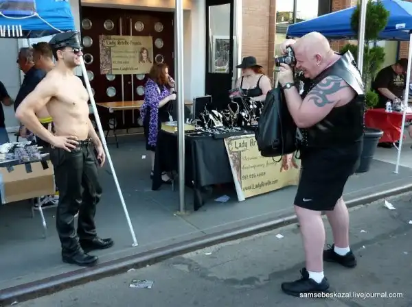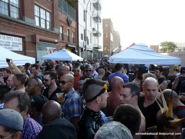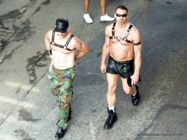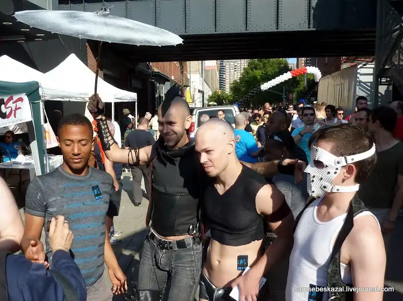 Ежегодно в Нью-Йорке проодит фестиваль "Folsom street east". За ничего не говорящим названием кроется очень необычное действо, напоминающее сцены из знаменитого, по фильму Полицейская академия, бару "Голубая устрица". Дальше будет очень много мужчин в очень непривычном одеянии. И не только...