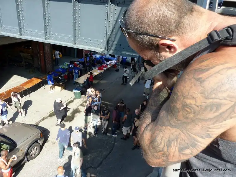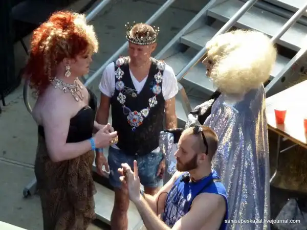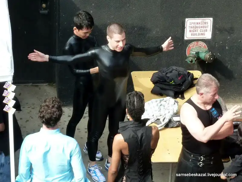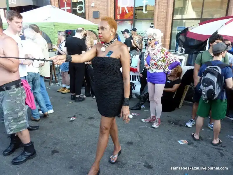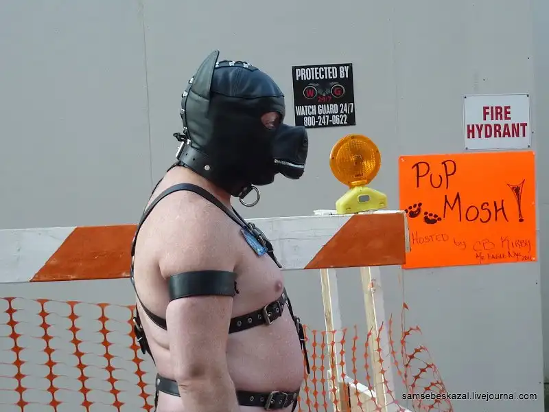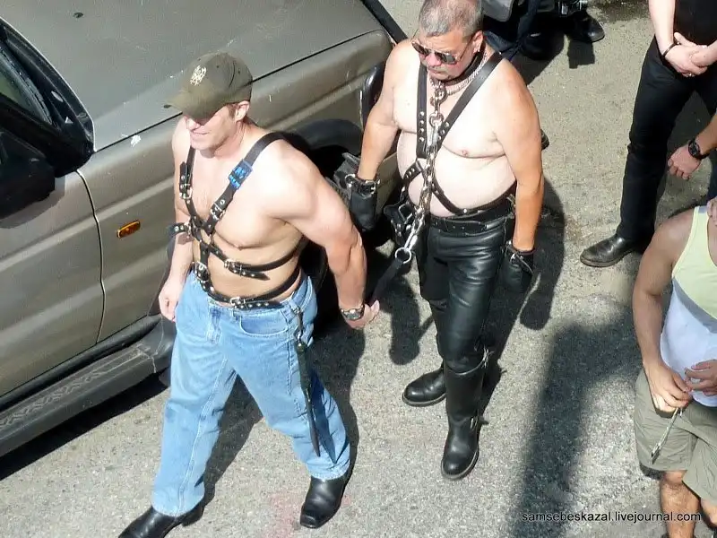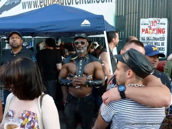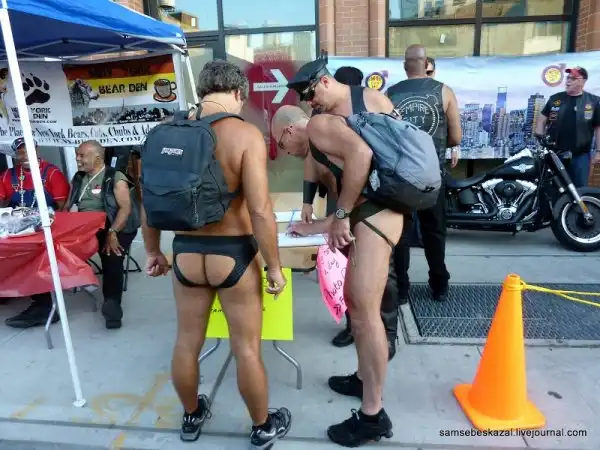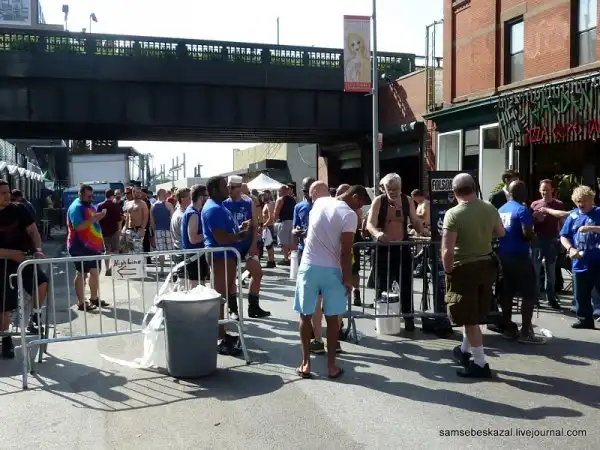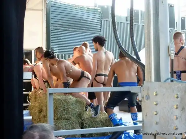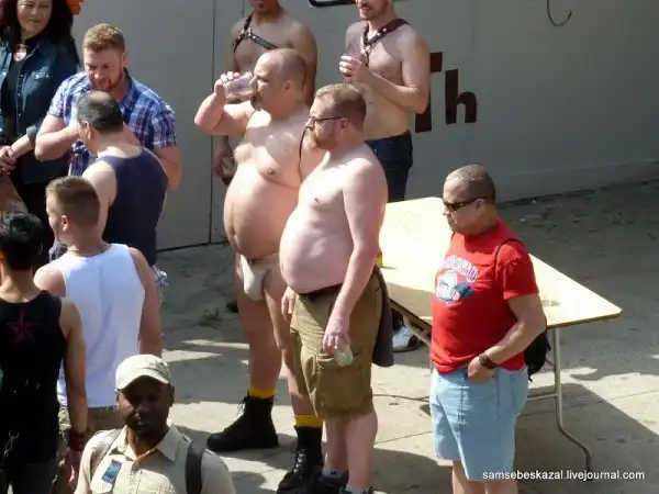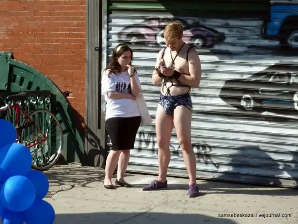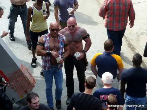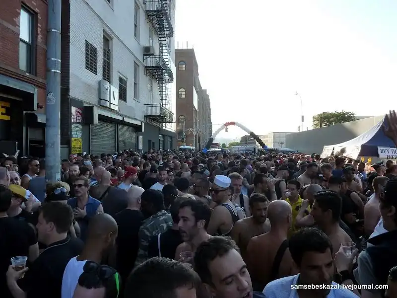 Ежегодно в Нью-Йорке проодит фестиваль "Folsom street east". За ничего не говорящим названием кроется очень необычное действо, напоминающее сцены из знаменитого, по фильму Полицейская академия, бару "Голубая устрица". Дальше будет очень много мужчин в очень непривычном одеянии. И не только...