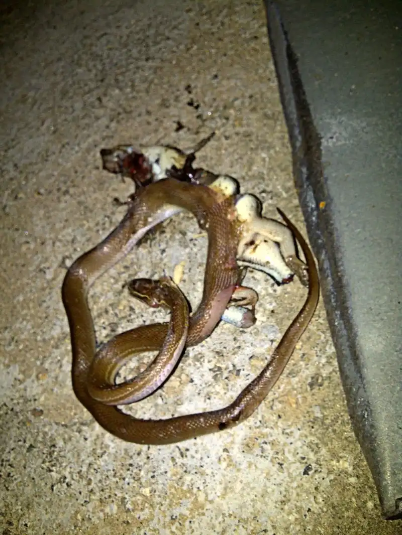 Змеи частенько ошибаются в выборе жертвы, за что платят собственной жизнью. Вот пример: одна змейка заживо проглотила ящерицу, и так умудрилась прогрызть себе путь наружу. Но это ей не особо помогло, поэтому в схватке так и не обозначился победитель.