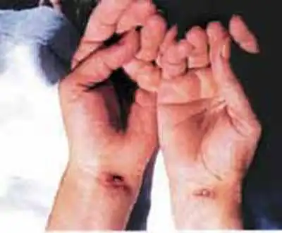 А на этом снимке вы можете проследить весь процесс... Интересно,что, кроме того, у многих стигматиков отмечается деформация одного плеча, словно опущенного под тяжестью огромного креста...