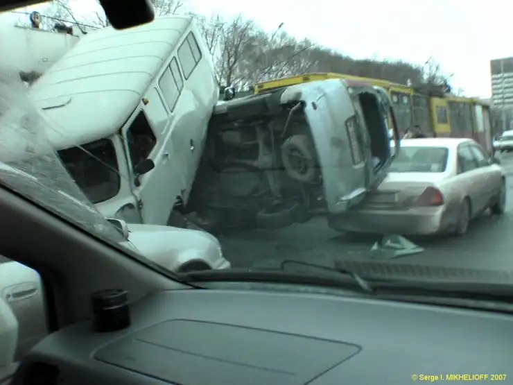 Многотонная махина смяла 17 автомобилей. От сильного удара один из них попал под трамвай. Никто серьезно не пострадал лишь по счастливой случайности.