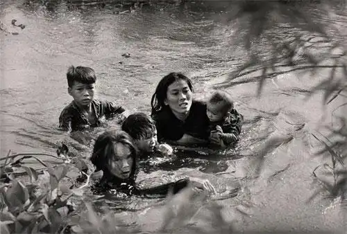 Сентябрь 1965 года.Бин Дин в Южном Вьетнаме. Мать и дети форсируют реку, спасаясь от американской бомбардировки с воздуха. Автор Киоичи Савада ("Юнайтед Пресс Интернешнл").