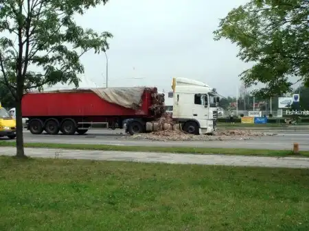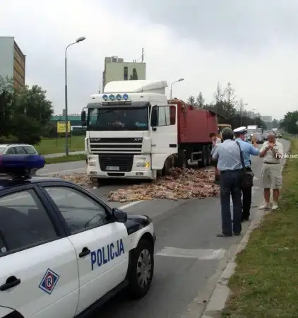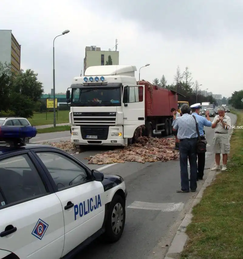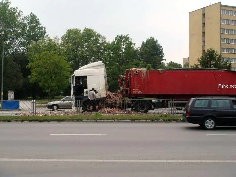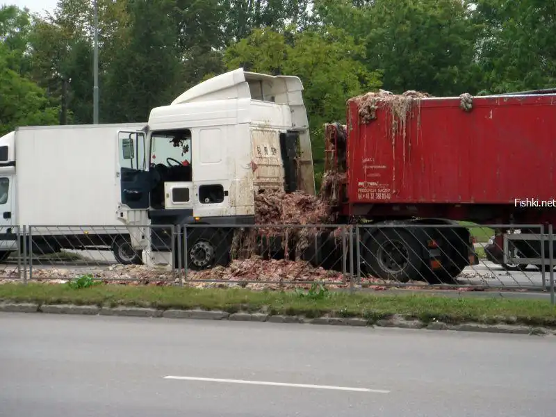 ...и перевозимый груз вывалился из кузова. Это были кишки животных, не для слабонервных. Действие происходило в Польше.