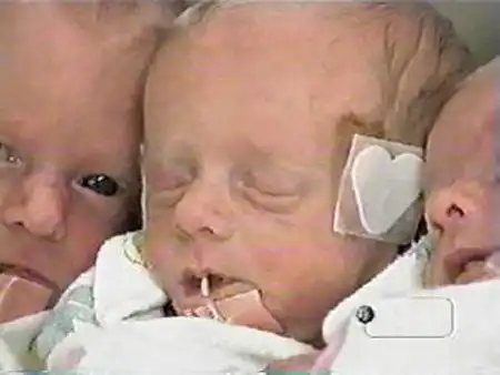 По неизвестным причинам, три года назад у пары было два выкидыша подряд, и они совсем было отчаялись завести ребенка. Врачи предложили использовать стимулирующий беременность препарат, после чего и произошло удивительное зачатие... Когда Дженни и Брайан узнали, что они ждут не одного, а целых шестерых ребятишек, удивлению и шоку их не было предела. Врачи советовали оставить только троих, но Дженни была категорически против. Отец назвал новорожденных "длинными и тощими", что не странно при среднем весе 1 кг и длине 40 см...
