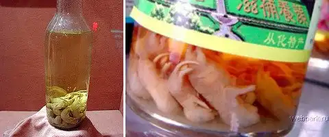 Этот традиционный оздоровительный напиток пьют в Китае и Корее, на вкус он, говорят, как керосин. Маленькие мышата, еще слепые, лежат в бутылках рисового вина. Трогательно.
