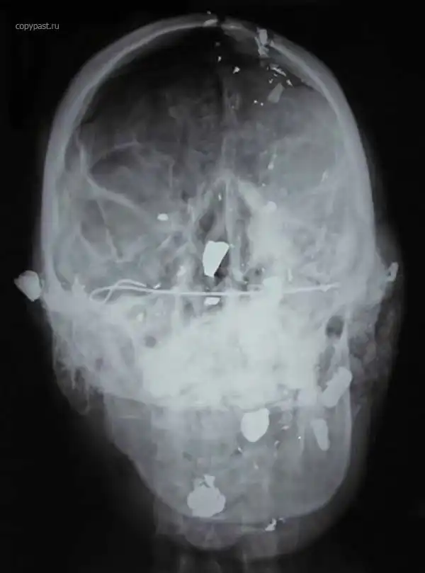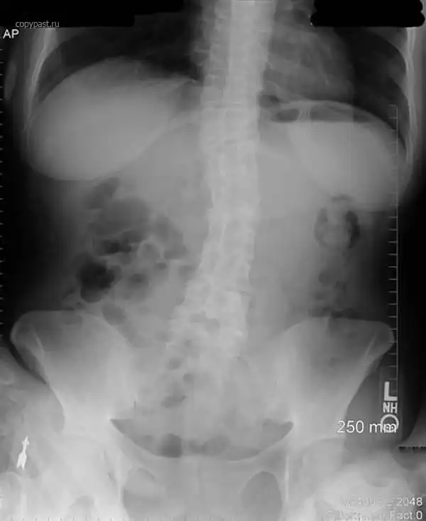 Человек проглотил зубную щетку. Справа в верхней части видна ее головка