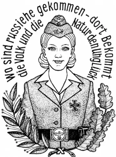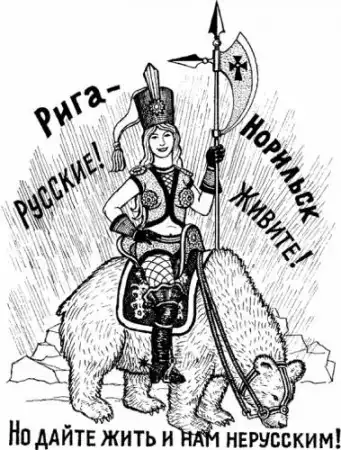 Эстонская татуировка. Выполнена на животе. Надпись: «Там, куда пришли русские, народ в беде и природа погибает» (нем.). Скопирована в морге Обуховской больницы в 1965 году. Живот.