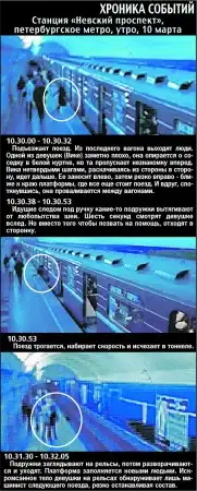 10:31:30 Подружки нерешительно приближаются к краю платформы, заглядывают на рельсы. Секунду стоят, рассматривая ужасающее зрелище, потом разворачиваются и уходят. Платформа заполняется новыми людьми.