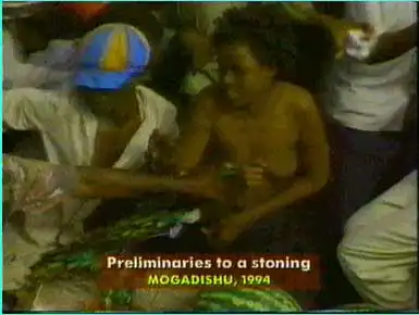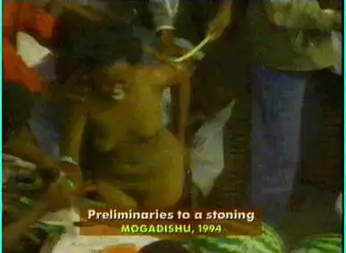 Вот подлинные фотографии иллюстрирующие подобную казнь. На этих фотографиях, изображено унизительное приготовление к казни в Могадиши, где по местным законам приговоренная к смерти девушка должна раздеться до гола на глазах у толпы, прежде чем ее забьют насмерть камнями. Несчастной даже не позволяют прикрыть наготу руками. 1994 год.