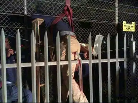 Испугавшись, он залез на дерево и попытался перепрыгнуть через забор...