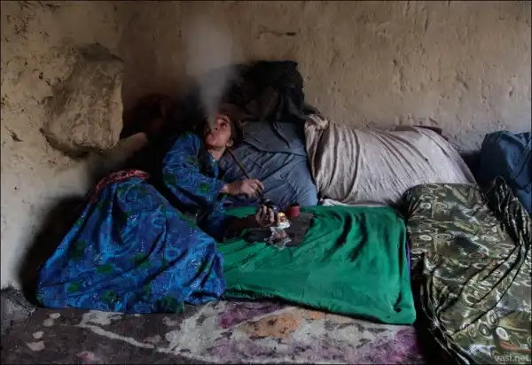 Ян Бегум делает перерыв между курением опиума у себя дома в афганской провинции Бадахшан. «Я курю опиум вот уже 18 лет», - говорит Бегум, которая послала своего 14-летнего сына работать на наркодиллеров, чтобы семья могла платить за наркотики.