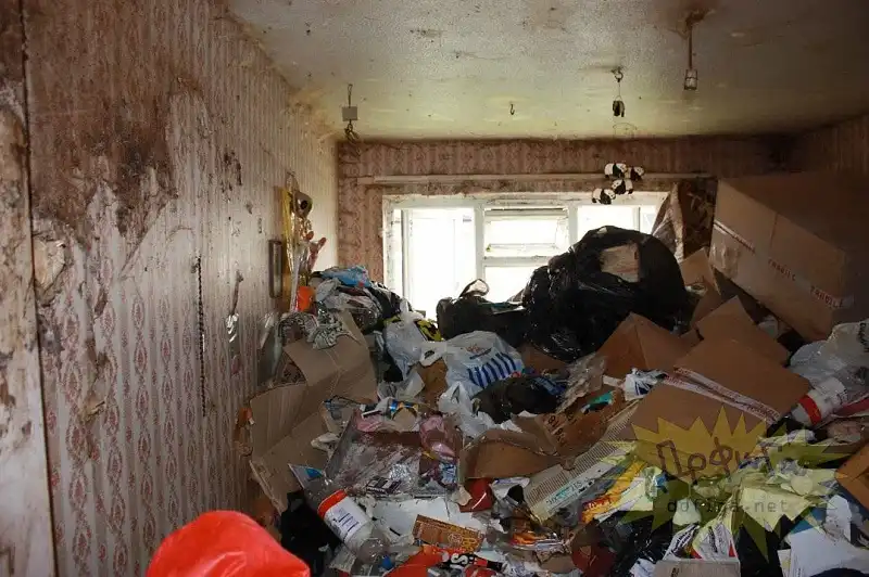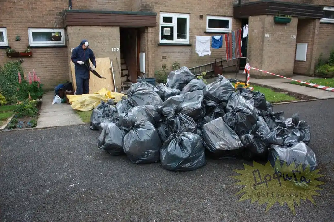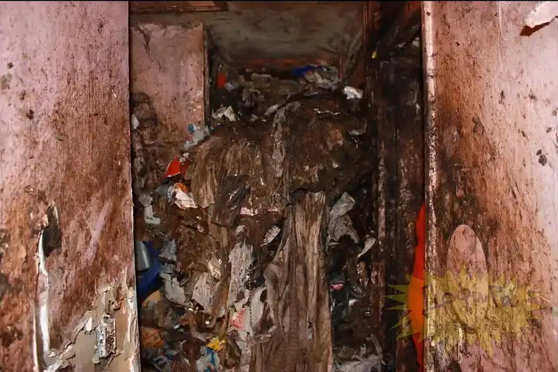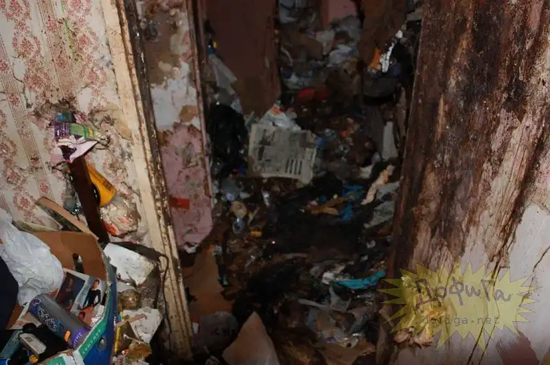 В этом доме жили муж и жена , 8 лет ... В туалет они ходили прямо на пол или на стены , или на мебель , в общем куда придётся . В собственных экскрементах они и спали. В общей сложности , на каждого человека , за эти годы пришлось более 9 тонн мусора .