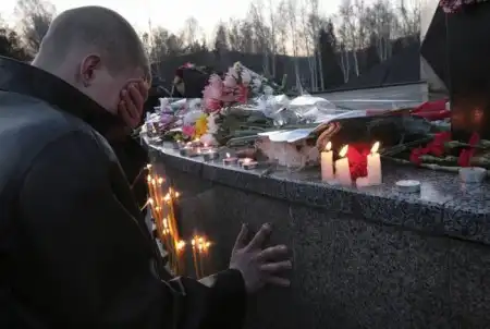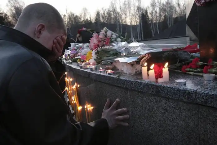 Мужчина рядом с памятником, на котором стоят свечи в память о погибших в ночь с 8 на 9 мая шахтерах. Трагедия на “Распадской” – это не первая крупная авария, связанная с горняками, за эту весну: в начале апреля в Китае прошла масштабная операция по спасению шахтеров. (AP)