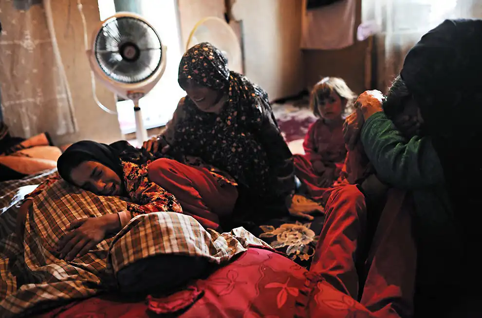 3. Медсестра Фатима Мохаммади успокаивает Ганифэ во время перевязки. Ганифэ вышла замуж около шести месяцев тому назад. Она жила одна с родителями мужа, который уехал на заработки в Иран.