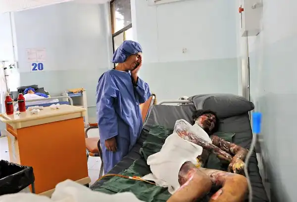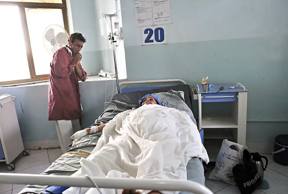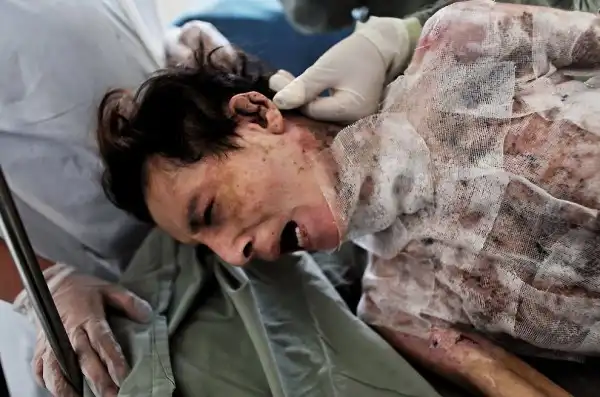 9. 32-летний Джума Гюль плачет у постели своей 45-летней матери Гюль Зада, примерно за час до ее смерти в ожоговом центре Региональной больницы Герата. Сын рассказывает, что за день до того, как его мать совершила самосожжение, она вместе со своими детьми пошла к сестре на семейный праздник. Казалось, что все было в порядке. Однако позже выяснилось, что женщина не принесла подарок, и родственники выругали ее за это. «Бедность – это одна из причин, по которой женщины поджигают себя,» - говорит доктор Ариф Джалали, старший хирург Региональной больницы Герата. Они наивно полагают, что смерть от самосожжения мгновенна.