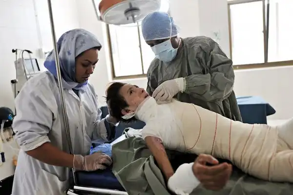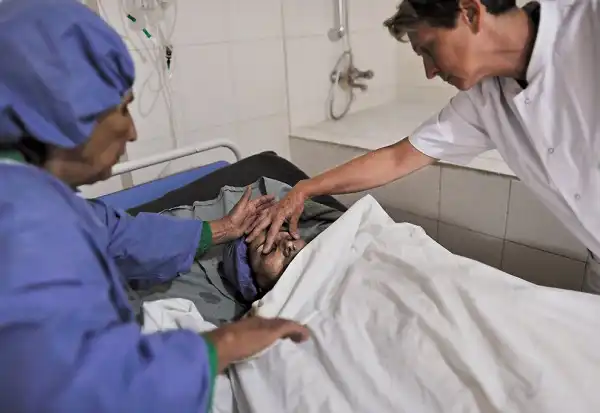 10. Мария Жозе Брюнель, французская медсестра международной неправительственной организации Humaniterra закрывает глаза покойной Гюль Зада. «Она уже шла на поправку» – утверждал ее сын. Но на самом деле у женщины началось заражение, а у ее семьи не было денег на покупку необходимых сильнодействующих антибиотиков. В считанные дни инфекция убила женщину, пока Джума пытался наскрести необходимую сумму.
