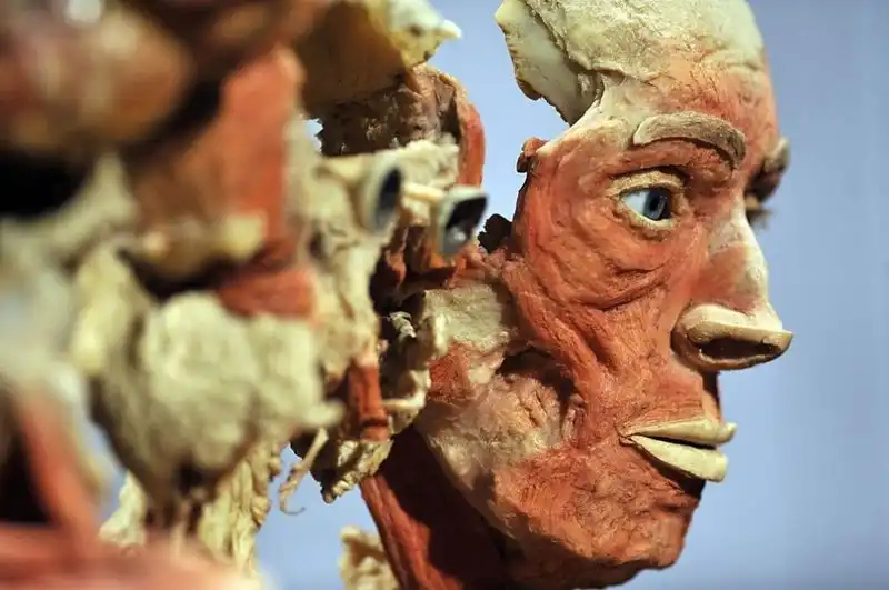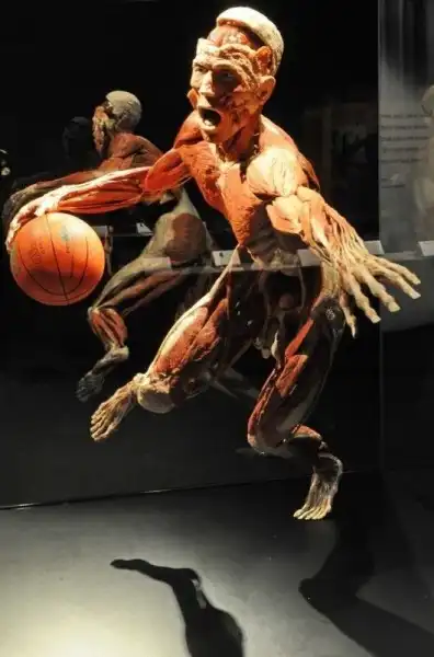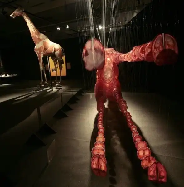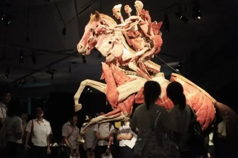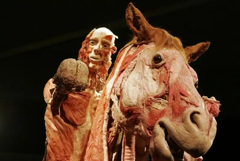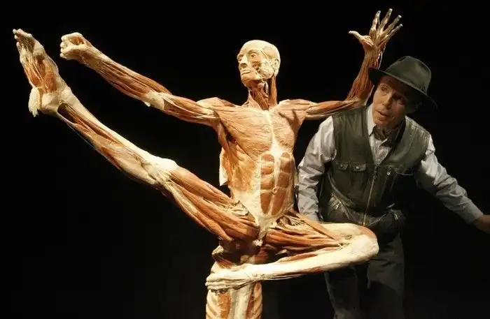 8. В течение следующих двух лет Гюнтер фон Хагенс организовал работу своей скандально знаменитой выставки «Миры тела», где выставлялись тела людей и животных, превращенные в пластинаты. Тела людей со снятой кожей были установлены в живые позы, многие тела при этом разрезаны на несколько полос так, чтобы была видна внутренняя структура.