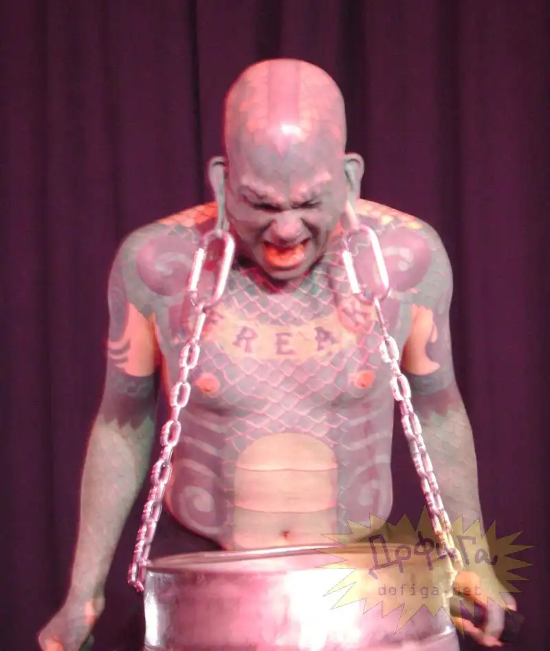 Ронаван Даг , забивает в нос гвозди и удерживает на щеках около 3 кг.