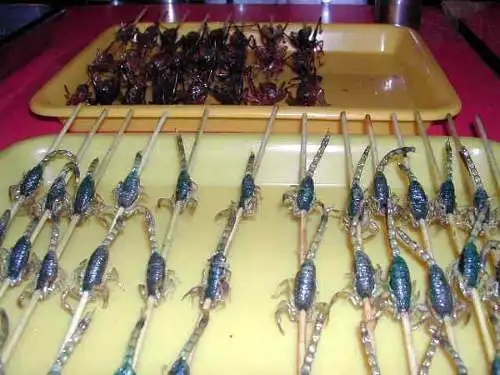 Съедается скорпион целиком. Тело внутри имеет белый, местами коричневый, цвет. В китайских ресторанах скорпионов чаще всего варят на пару и подают на тонкой лепешке с легким кислым соусом и овощами. Эта закуска имеет экзотический вкус, хрустит на зубах, а если скорпион внутри не пустой, то имеет чуть горьковатый привкус. Считается афродизиаком.