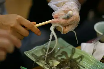 А в Корее можно полакомиться живыми осьминогами, даже в ресторан идти не придется – их продают прямо на улице. Небольших особей разрезают на кусочки, спрыскивают кунжутным маслом и немедленно подают – в это время щупальца все еще двигаются. Без предварительной тренировки вы вряд ли сможете съесть этот извивающийся деликатес: даже расчлененный осьминог будет бороться за свою жизнь до последнего. Щупальца сначала нужно отодрать от палочек, а уже во рту от зубов, языка и неба, и очень тщательно пережевать.