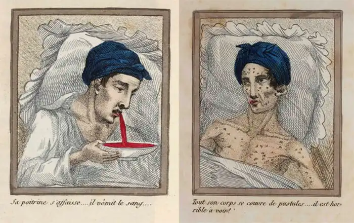 его грудь содрогается, его рвет кровью, язвы покрывают его тело, его вид ужасен