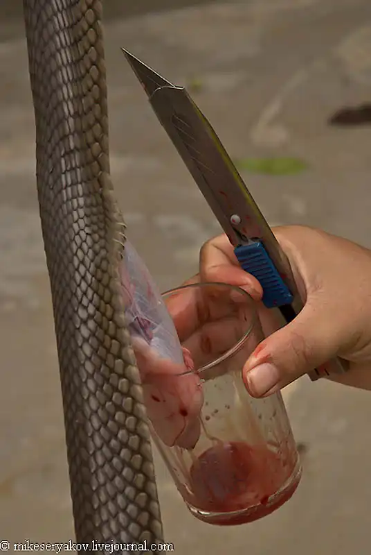 Но есть и другое – можно попробовать выпить свежей змеиной крови и съесть ещё трепыхающееся сердце кобры. Считается, что если выпить кровь животного с совершенной иммунной системой, то повысится и собственный иммунитет, поэтому люди пьют крокодилью и змеиную кровь. А сердце едят для того, чтобы получить силу, того животного, которое было убито. Не могу сказать, что я сильно уверовал в это, но интерес жуткая движущая сила и я решил попробовать.
