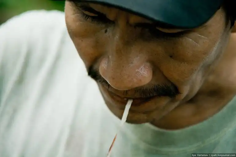 Индейцы делают 2 блюда - шашлычок, и личинки в собственном соку, запеченные в пальмовом листе.