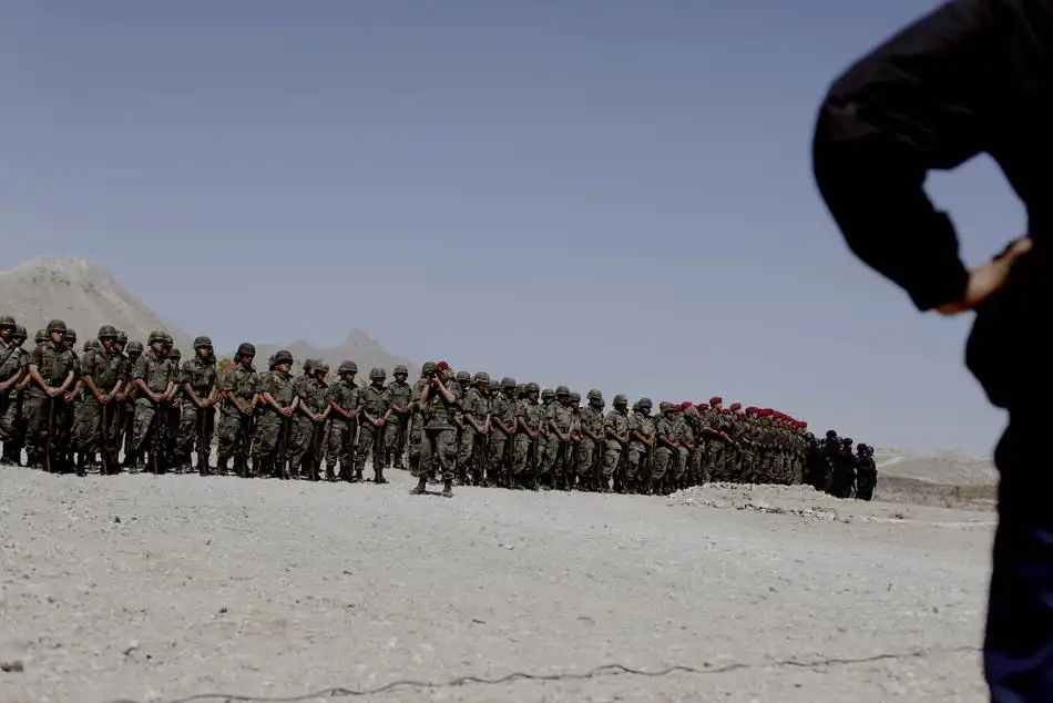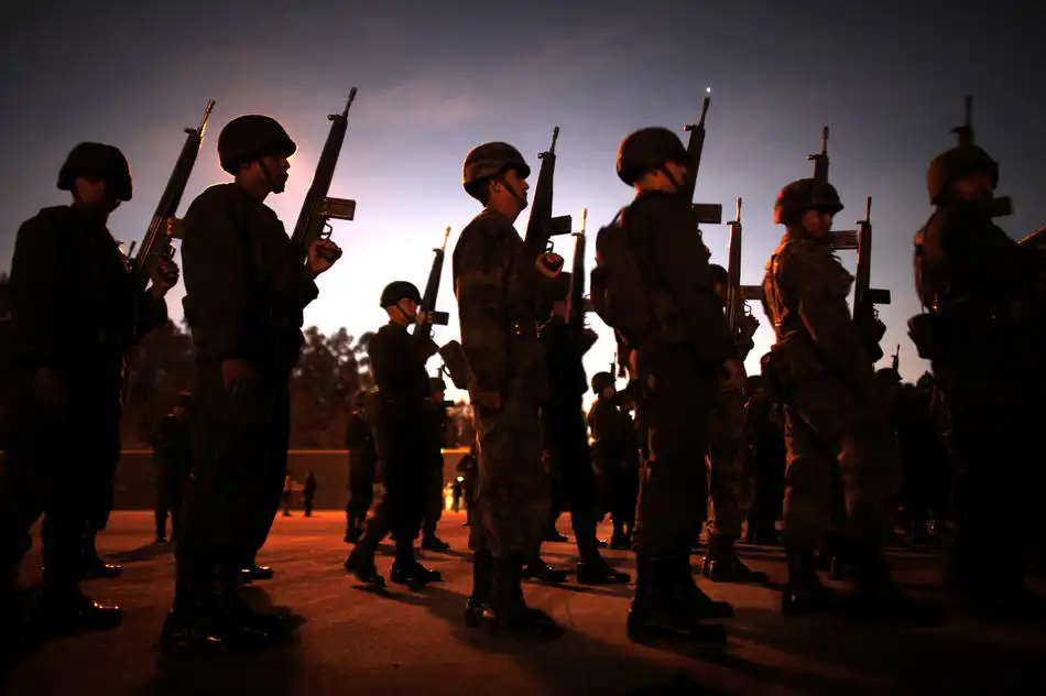 Солдаты в строю перед погрузкой в машины в Военном училище в Мехико и отправкой на уничтожение плантаций, принадлежащих наркокартелям. Всего в войне с наркомафией приняли участие 45 000 полицейских и солдат и несколько тысяч морских пехотинцев. По различным данным за это время погибло 45 000 человек, хотя правительство Мексики перестало публиковать статистику, когда цифра достигла 35000.