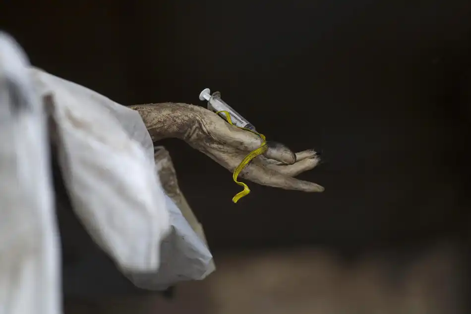 Рука одного из трупов в морге, где судебные эксперты пытаются идентифицировать тела, найденные в спрятанном массовом захоронении в Дуранго, Мексика.