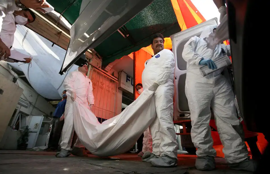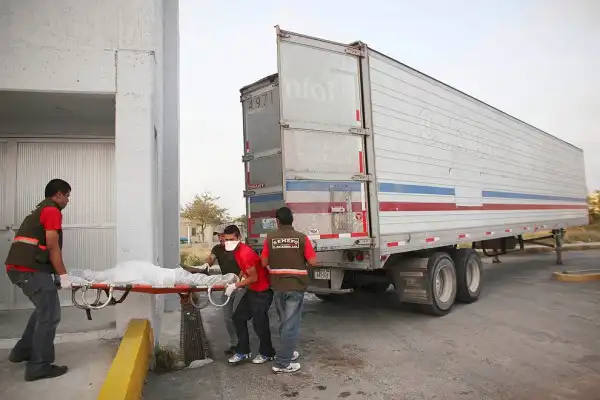 Работники морга переносят найденное на месте массового захоронения тело в морг в Матаморосе 7 апреля. Службы безопасности, выехав на вызов по поводу похищения пассажиров в штате Тамаулипас на границе с Техасом, наткнулись на ямы с 59 телами, недалеко от ранчо, где в прошлом году преступники убили 72 рабочих-мигрантов из Центральной и Южной Америки.