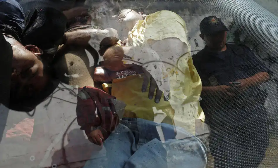 Отражение полицейских в окне такси, внутри которого было найдено шесть трупов, Акапулько, Мексика, 8 января 2011 года.