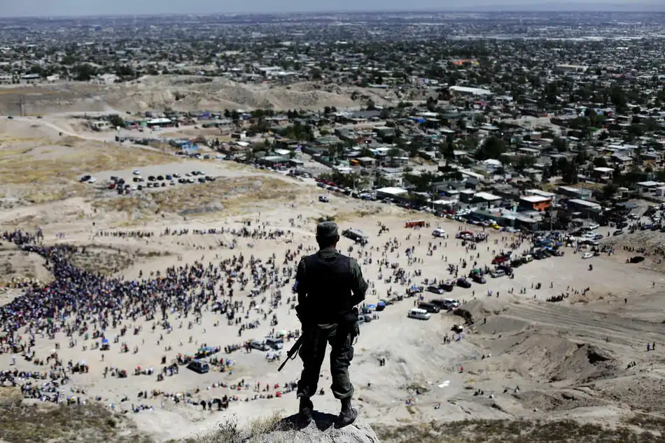 Солдат на посту на вершине холма охраняет массовые празднования Страстной пятницы в Сьюдад Хуаресе, Мексика, 10 апреля 2009 года.