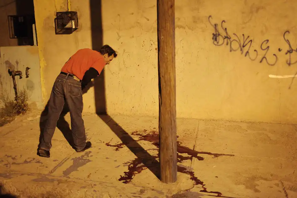 Местный житель рассматривает лужу крови на тротуаре, Сьюдад Хуарес, Мексика, 12 апреля 2009 года.