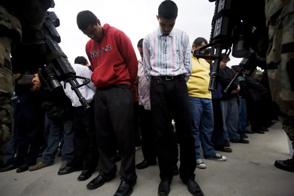 Федеральная полиция с подозреваемым после перестрелки в Тихуане 9 марта 2009 года.