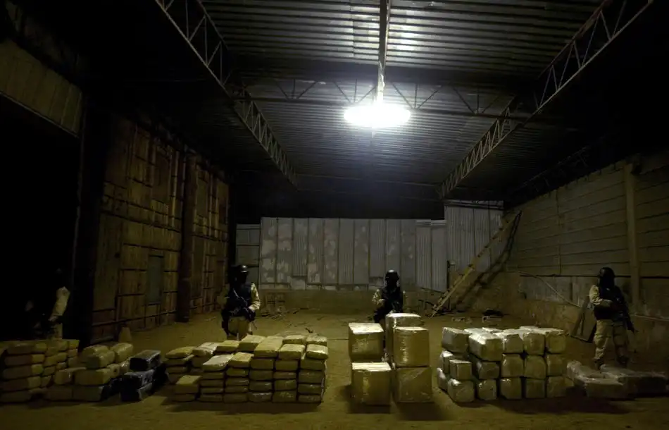 Солдаты охраняют пакеты с марихуаной на складе в Текате, Мексика, 8 апреля 2009 года. Было обнаружено 297 пакетов общим весом в 1900 кг марихуаны.